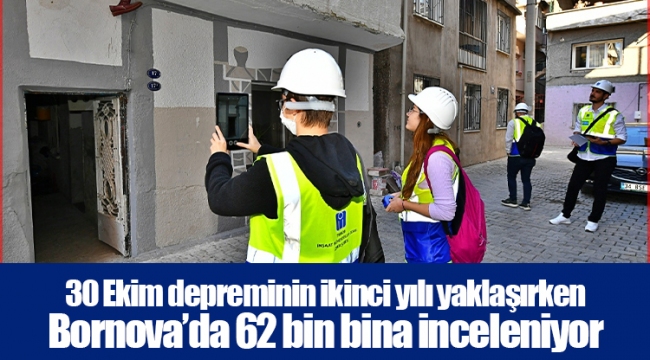 30 Ekim depreminin ardından kenti afetlere dirençli hale getirmek için çalışan İzmir Büyükşehir Belediyesi, Bayraklı’nın ardından Bornova’da yapı envanteri çalışmalarını başlattı. İnşaat Mühendisleri Odası İzmir Şubesi bünyesindeki 165 mühendis ve Ortadoğu Teknik Üniversitesi’nden (ODTÜ) beş akademisyenin yer aldığı çalışma kapsamında, ilçede bulunan 45 mahallede 62 bin yapı incelenecek. Çalışmayla bina kimlik belgesi oluşturulacak.