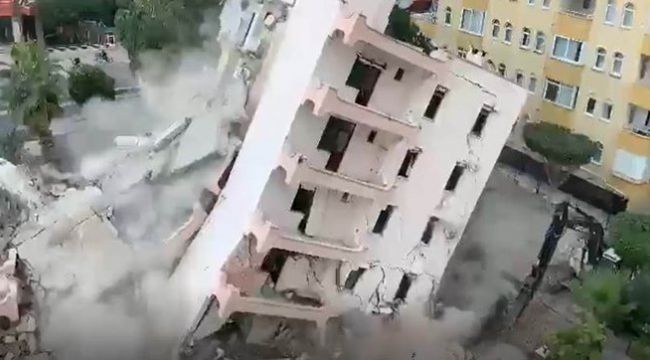 Antalya’nın Alanya ilçesinde kentsel dönüşüm kapsamında yıkımına karar verilen 5 katlı bir apartmanın yıkımını yapan kepçe operatörü enkaz altında kalmaktan sonra anda kurtuldu.