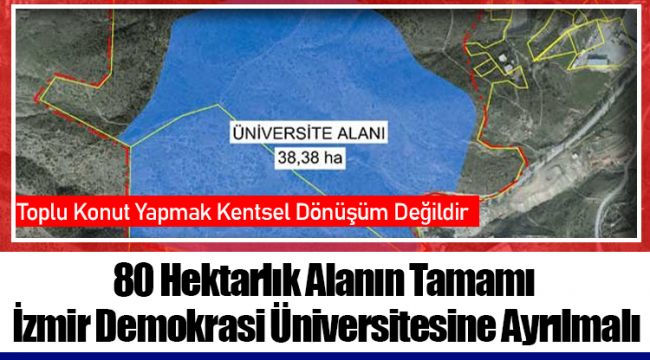 TOKİ tarafından üniversiteye ayrılan alanın Demokrasi Üniversitesi'ne yakışmadığını söyleyen Başkan Muhittin Selvitopu, 80 hektarın tamamının üniversite olması gerektiğini söyledi. Selvitopu " Oradaki ilk çalışmaları Konak Belediyesi’ndeyken biz başlattık. Kadastro çalışmaları yapıldı ve kayıtlara geçti. Sonrasında TOKİ'ye verildi. TOKİ'nin orada bir hakkı yoktu. Biz hatta TOKİ'ye devri ile ilgili de dava açtık. Biz çabaladık ve bir bölümü üniversiteye ayrıldı. Biz şimdide tamamının üniversiteye ayırmak istedik. Bu nasıl bir anlayış? İmar planı yapılmadan hiçbir kurum kendi başına bir şey yapamaz. TOKİ'ye devredilmişte olsa TOKİ orada plan yapmak zorunda. TOKİ bunu yapsa dâhil bizim de dava sürecimiz var ve bu haklarımızı kullanacağız. Karabağlar Belediyesi olarak hukuk bir karar verdiği andan itibaren onun gereğini yapıyoruz. Türkiye'deki tüm tutumlarda bunu yapmak zorunda... Burada belediye kendi kafasında gelişi güzel hareket eder durumda değiliz. Yasalar çerçevesinde hareket ediyoruz. Söylediklerimin tamamı Karabağlar da bulunan STK'ların ortak kararıdır. Üniversitenin yapılması planlanan alan küçük bir alan… 38 hektar demokrasi üniversitesine yakışmıyor. 80 hektarın tamamı üniversiteye verilsin diyoruz. Üniversite alanı nasıl kullanacaksa öyle kullansın diyoruz. Başka bir şey söylemiyor, istemiyoruz. Bunun kimseye zararı yok. Oraya konut yapılmasının da gerekli olmadığını söylüyoruz. Bunu da Karabağlar da yaptığımız planlamaya dayanarak söylüyoruz" dedi.