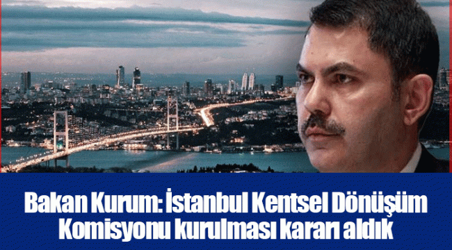 Deprem Dönüşümü Değerlendirme Toplantısı'nın ardından açıklamada bulunan Çevre, Şehircilik ve İklim Değişikliği Bakanı Murat Kurum, "İstanbul Kentsel Dönüşüm Komisyonu kurulması kararı aldık. Valimiz başkanlığındaki komisyonda belediyelerden gelen talepleri değerlendirip hızlı bir şekilde kararları alacağız. Komisyonun siyaset üstü bir bakışla İstanbul'un dönüşümü adına yapılması gereken her iş ve işlemi yürütecek" dedi.