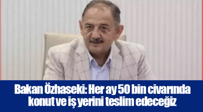 Deprem konutlarına ilişkin konuşan Çevre ve İklim Değişikliği Bakanı Mehmet Özhaseki, gelecek aylarda da her ay 50 bin civarında konut ve iş yerini teslim etmeye devam edeceklerini kaydetti.