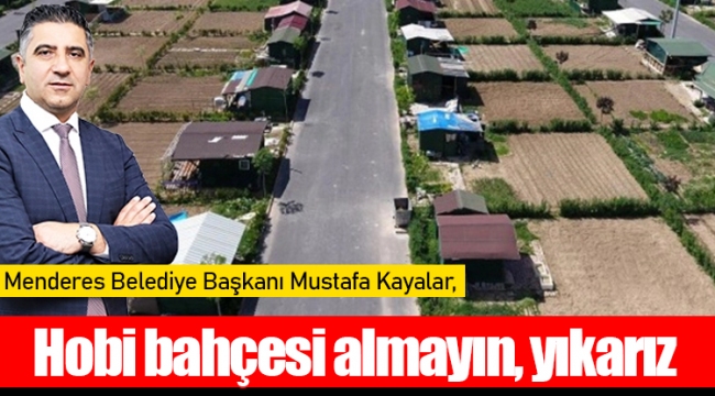 İnternet sitelerinde ilan verilen hobi bahçelerinin satın alınmaması konusunda vatandaşları uyaran ve çağrıda bulunan Kayalar, “Menderes’te 4 bin tane hobi bahçesi var. Hobi bahçelerini satmaya çalışanlar var. Kesinlikle bunları almayın, yıkacağız. Çünkü tapu yok. Hobi bahçelerinde imar barışı geçmiyor. İmar barışları iptal. Hobi bahçelerine ceza kesin diyenler var. Ceza keserseniz kayıt altına alınır af çıkarsa biz kurtuluruz diye düşünce var. Mahkemeden gelecek karara göre bunlar yıkılacak” dedi.