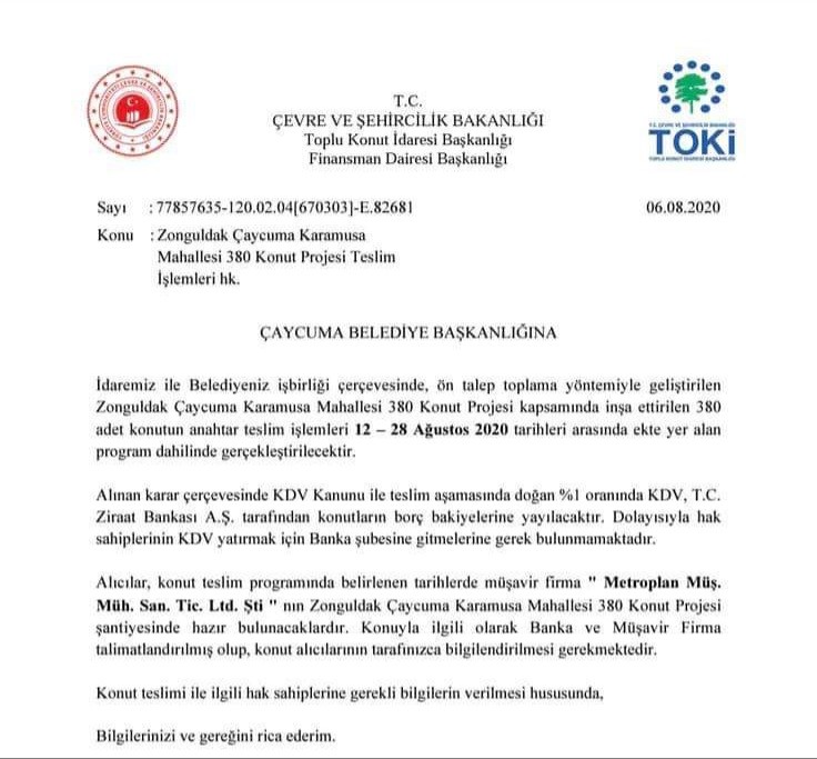 Zonguldak'ın Çaycuma ilçesinde TOKİ tarafından 380 Konut Proje kapsamında yapılan evlerin teslim tarihi açıklandı.
