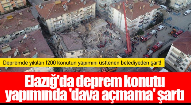 Elazığ'da 24 Ocak 2020'de meydana gelen ve 41 kişinin hayatını kaybettiği 6.8 büyüklüğündeki depremde yıkılan bin 200 konutun yapımını üstlenen belediye, konutları yapılacak yurttaşlarla yaptığı sözleşmeye yıkılan konutlar için dava açmama şarttı koydu. Belediye ayrıca, daha önce açılan davalardan da vazgeçme şartı ekledi.