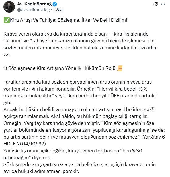 Bozdağ, kiraya veren olarak ya da kiracı tarafında olsanız kira ilişkilerinde “artırım” ve “tahliye” mekanizmalarının güvenli biçimde işlemesi için sözleşmeden ihtarnameye, delilden hukuki zemine kadar dikkat edilmesi gereken detaylar olduğubu 2 maddede açıkladı. İşte ayrıntılar;
