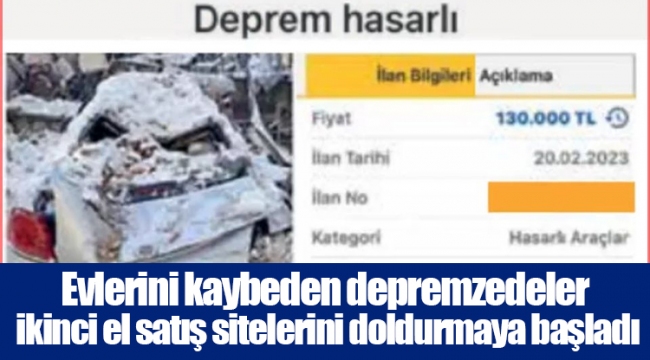 Depremlerde evlerini kaybeden vatandaşlar acil nakit ihtiyaçlarını karşılamak için ağır hasarlı otomobillerini ikinci el araç sitelerinde satışa çıkarmaya başladı. Hatay, Kahramanmaraş, Adıyaman plakalı birçok hasarlı otomobilin ilan sitelerindeki sayısı her geçen gün artarken konuştuğumuz depremzedeler, “Evimizi, eşyalarımızı kaybettik. Elimizde paraya çevirebileceğimiz sadece otomobil kaldı. Yeni bir hayat kurmak için satmak zorundayız” dedi.