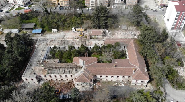 Tarihi Hadımköy Askeri hastanesinde başlatılan restorasyon çalışmaları drone ile havadan görüntülendi. Görüntülerde iş makineleri ile yıkılan yerlerin hafriyat kamyonları ile taşındığı ve hastane binasının çatısının bir kısmının yıkıldığı görülüyor.