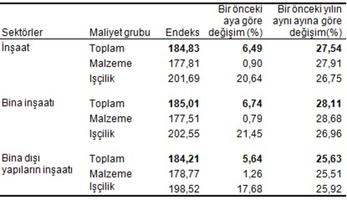Bina inşaatı maliyet endeksi, bir önceki aya göre yüzde 6,74, bir önceki yılın aynı ayına göre yüzde 28,11 arttı. Bir önceki aya göre malzeme endeksi yüzde 0,79, işçilik endeksi yüzde 21,45 arttı. Ayrıca, bir önceki yılın aynı ayına göre malzeme endeksi yüzde 28,68, işçilik endeksi yüzde 26,96 arttı.