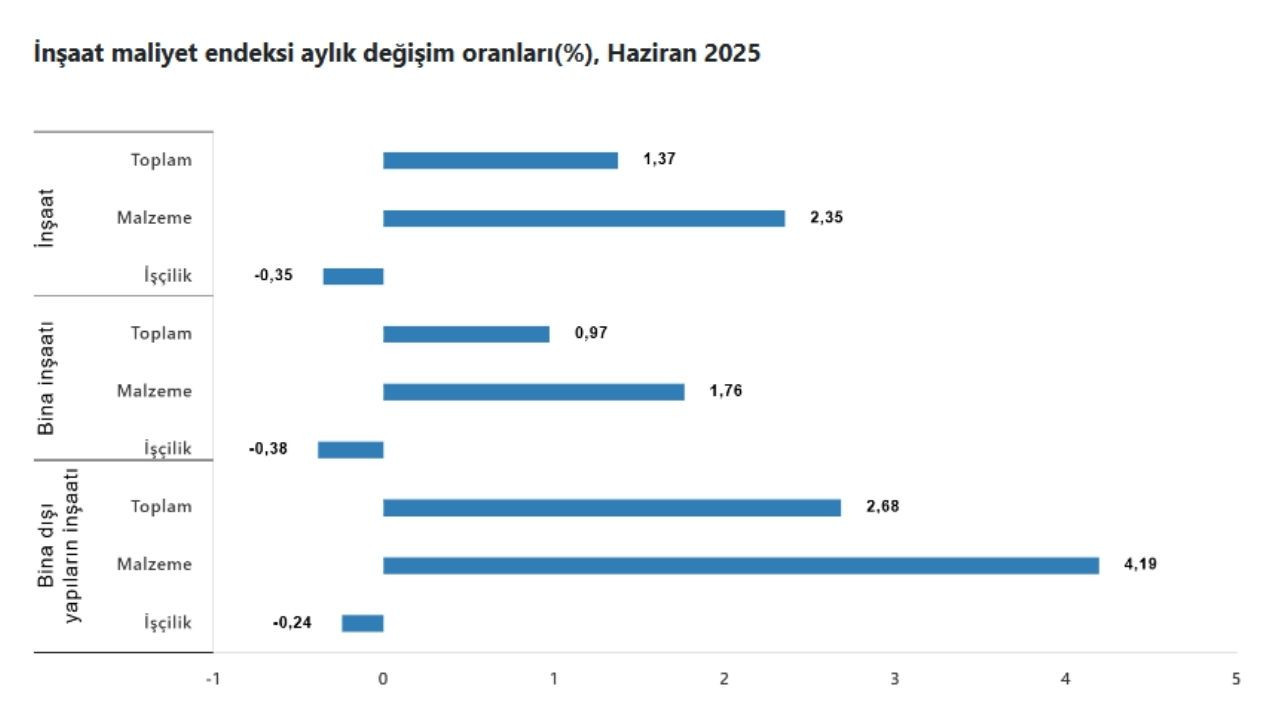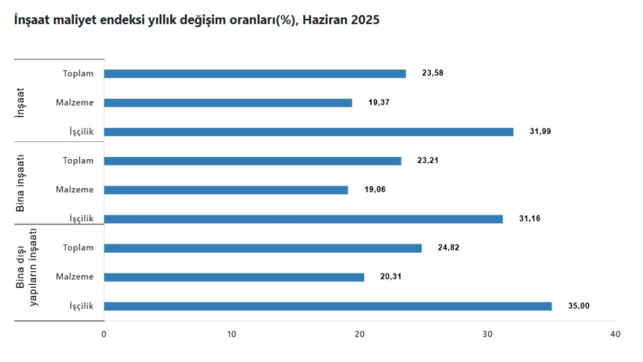 Türkiye İstatistik Kurumu, Haziran 2025 inşaat maliyet endeksi verilerini açıkladı. Buna göre, inşaat maliyetleri yıllık yüzde 23,58 arttı. Haziran 2025 döneminde, bir önceki aya kıyasla maliyetler yüzde 1,37 arttı. Malzeme fiyatlarında ise maliyetler bir önceki aya göre yüzde 2,35 arttı, işçilik ise yüzde 0,35 ucuzladı. Ayrıca bir önceki yılın aynı ayına göre malzeme endeksi yüzde 19,37 arttı, işçilik endeksi yüzde 31,99 arttı.