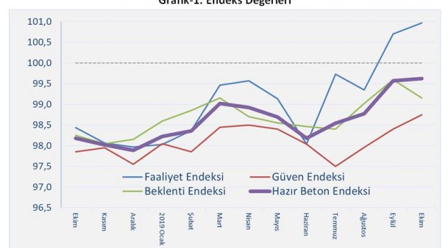 Hazır Beton Endeksi 2019 Ekim Ayı Raporu’na göre, bütün endeksler önceki yılın aynı dönemine göre artış sergiledi. Geçen yılın aynı ayına kıyasla geride bıraktığımız ekim ayında sektörde önemli bir canlanma söz konusudur. Son 2 yıllık faaliyet incelendiğinde inşaat faaliyetlerinde ilk kez iki ay üst üste devam eden bir hareketlilik olduğu görülmektedir.