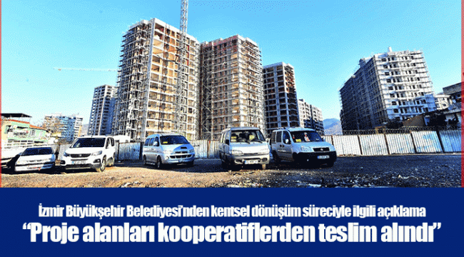 İzmir Büyükşehir Belediyesi, yapım işlerinin durdurulmasına ilişkin yasal süreçlerin ardından Örnekköy 3. ve 4. Etap, Uzundere 3. ve 4. Etap kentsel dönüşüm proje alanlarının, yüklenici ve ruhsat sahibi İZBETON AŞ tarafından mahkemelerin raporlarında tespit edildiği şekilde teslim alındığını duyurdu.