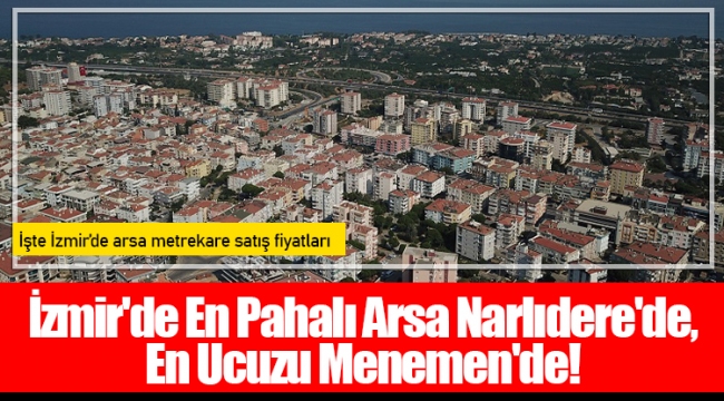 İzmir’de imarlı arsa fiyatlarının en yüksek olduğu ilçe Narlıdere. Narlıdere imarlı arsaların metrekare fiyatı 3.477 TL. Narlıdere’yi 2.635 TL ile Bornova, 2.590 TL ile Karşıyaka takip ediyor.