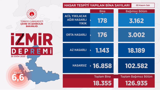 İzmir’de 942 personelimizle hasar tespit çalışmalarımızı aralıksız sürdürüyoruz. Tespitlerimizi bir an önce tamamlayarak kentsel dönüşüm çalışmalarımızı başlatacak, vatandaşlarımızın yarasını saracağız. pic.twitter.com/35aSxZTQC6