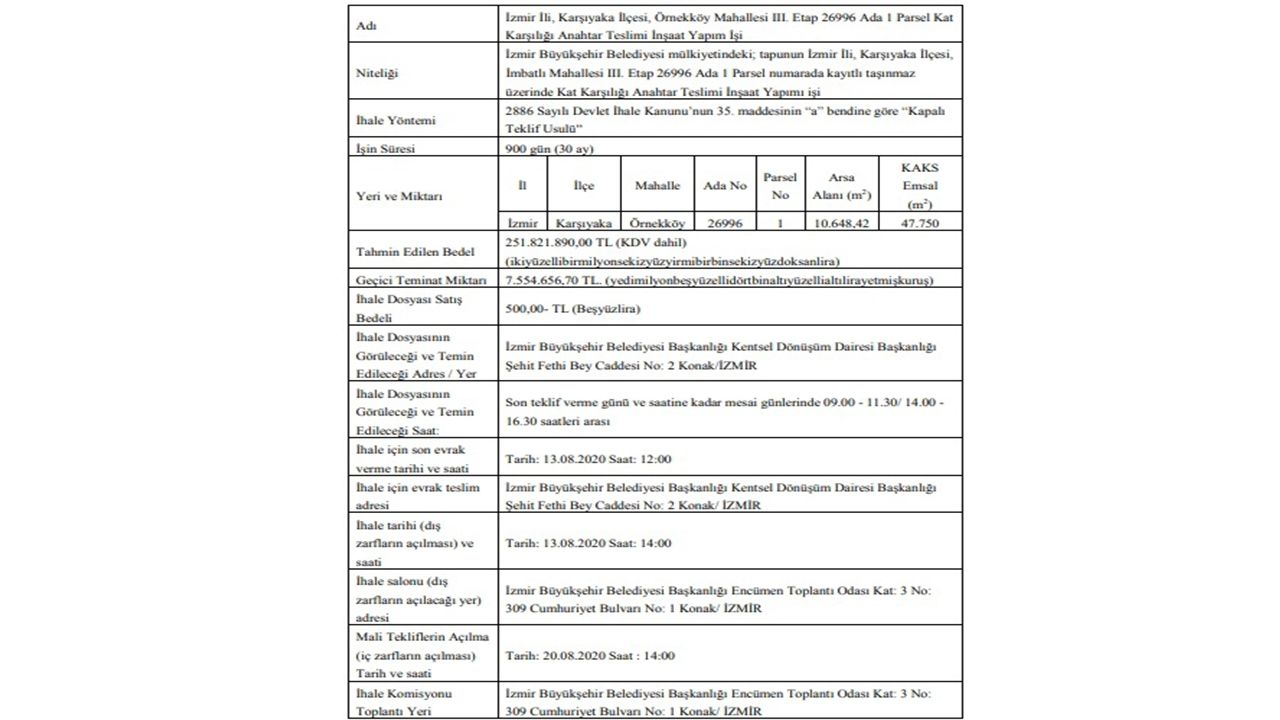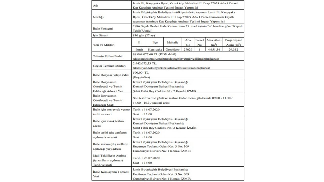 1 - İsteklilerin ihaleye katılabilmesi için; işe ait İdari Şartnamede belirtilen belgeleri ve hazırlayacakları tekliflerini, İzmir Büyükşehir Belediyesi Başkanlığı Kentsel Dönüşüm Dairesi Başkanlığı Şehit Fethi Bey Caddesi No: 2 Konak/ İZMİR adresine teslim etmesi veya posta yoluyla ulaştırmış olması gerekmektedir. Postada oluşacak gecikmelerden İdare sorumlu değildir.