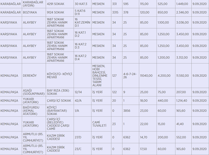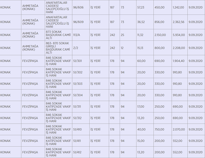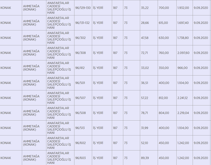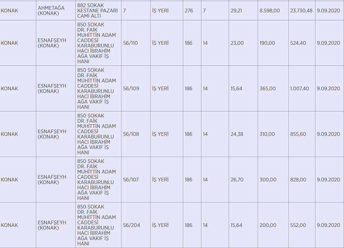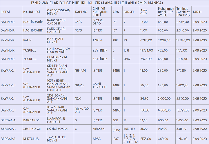 1- İşbu listede özellikleri yazılı taşınmazlar karşılarında yazılı muhammen bedeller üzerinden dosyasındaki "Vakıf Taşınmazları Kira Genel Şartnamesi" dahilinde 09.09.2020 Çarşamba- 10.09.2020 Perşembe günleri yukarıda belirtilen saatlerde İzmir Vakıflar Bölge Müdürlüğü Hizmet Binasında başlayacak olan ihale ile 2886 sayılı Kanunun 45. maddesine göre açık teklif usulü noter onaylı sözleşme ile kiraya verilecektir.