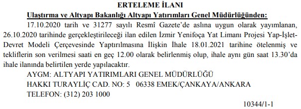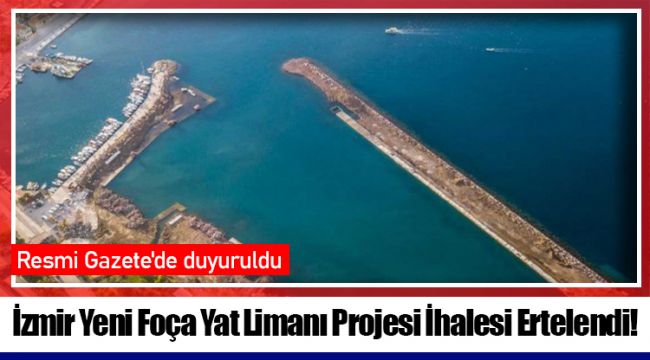 Ulaştırma ve Altyapı Bakanlığı Altyapı Yatırımları Genel Müdürlüğü tarafından 9 Aralık 2020 tarihli Resmi Gazete ile yayımlanan karar kapsamında İzmir Yeni Foça Yat Limanı projesi ihalesinin 18 Ocak 2021 tarihine ertelendiği ilan edildi. Yapılan açıklamada "17.10.2020 tarih ve 31277 sayılı Resmî Gazete’de aslına uygun olarak yayımlanan, 26.10.2020 tarihinde gerçekleştirileceği ilan edilen İzmir Yenifoça Yat Limanı Projesi Yap-İşlet-Devret Modeli Çerçevesinde Yaptırılmasına İlişkin İhale 18.01.2021 tarihine ötelenmiş ve tekliflerin son verilmesi saati en geç 12.00 olarak belirlenmiş olup, ihale aynı gün saat 13.30’da ihale ilanında belirtilen yerde yapılacaktır" ifadelerine yer verildi.