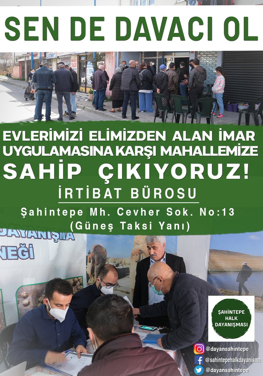 Açıklamasında “Tek başına çözüm yok” diyen Şahintepe Halk Dayanışması, “Yıllardır mahallemizin imar sorununu çözeceklerinin sözünü verenler, Kanal İstanbul projesini gerekçe göstererek bizleri Arnavutköy’e sürgün etmeye çalışıyor. Bizlere verilen imar sözlerinin tutulmasını istiyoruz. Masal değil halktan yana icraat görmek istiyoruz” ifadelerini kullandı.Sürgün politikalarını kabul etmediklerini ve mahalleye sahip çıkacaklarnı belirten Şahintepeliler, evlerini Şahintepe’den Arnavutköy’e taşıyan imar uygulamasını iptal ettirmek için perşembe günü saat 11.00′ da İstanbul Bölge İdare Mahkemesi önünde buluşup davalarını açacak.