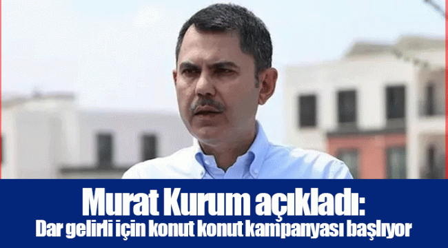 Çevre, Şehircilik ve İklim Değişikliği Bakanı Murat Kurum dar gelirli için konut kampanyasının başlayacağını duyurdu. Konutların Emlak Konut aracılığıyla yapılacağını söyleyen Kurum, kampanyanın uygun vade oranlarıyla düşük peşinat ya da peşinatsız sunulacağını açıkladı.