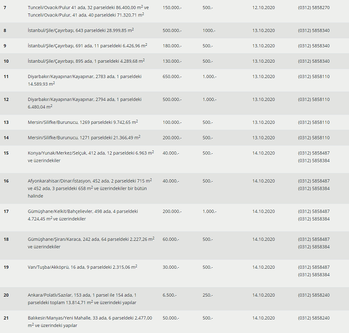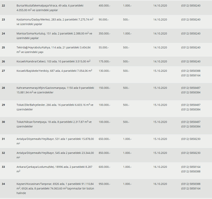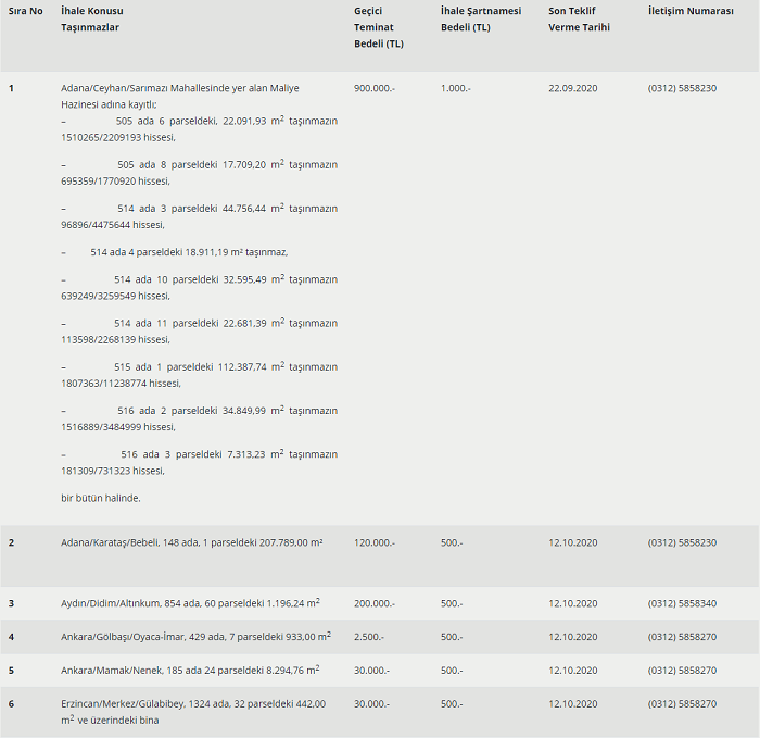 İstanbul, İzmir, Adana, Ankara, Mersin, Antalya, Aydın, Muğla, Diyarbakır, Erzincan, Afyonkarahisar, Tunceli, Gümüşhane, Van, Kayseri, Konya, Bursa, Balıkesir, Kastamonu, Tekirdağ, Kocaeli, Kahramanmaraş ve Tokat'ta 40 adet gayrimenkulü satışa çıkardı.