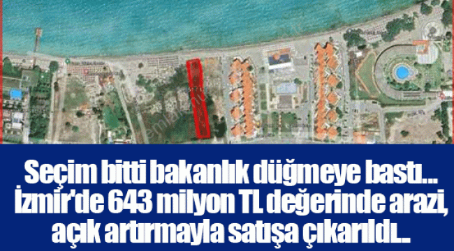 Son Kale İzmir'de yer alan habere göre Seçimlerin ardından hükümetin kamu arazilerini satışı iyice hızlandı. Henüz 2 hafta önce TOKİ'nin İzmir'de 900 milyon TL'lik arazi satışının ardından, bu kez de Çevre, Şehircilik ve İklim Değişikliği Bakanlığı 44 kentteki kamuya ait 670 araziyi satışa çıkardı. Çevre Bakanlığı'nın satışa çıkardığı araziler içerisinde 24'ünü İzmir'dekiler oluşturdu. İzmir'in en gözde yerleri olan Çeşme, Urla, Güzelbahçe, Bergama, Dikili, Karaburun, Menderes ve Torbalı'da açık artırmayla satışa çıkarılan araziler için toplam 643 milyon 665 bin 822 TL muhammen bedel belirlendi.