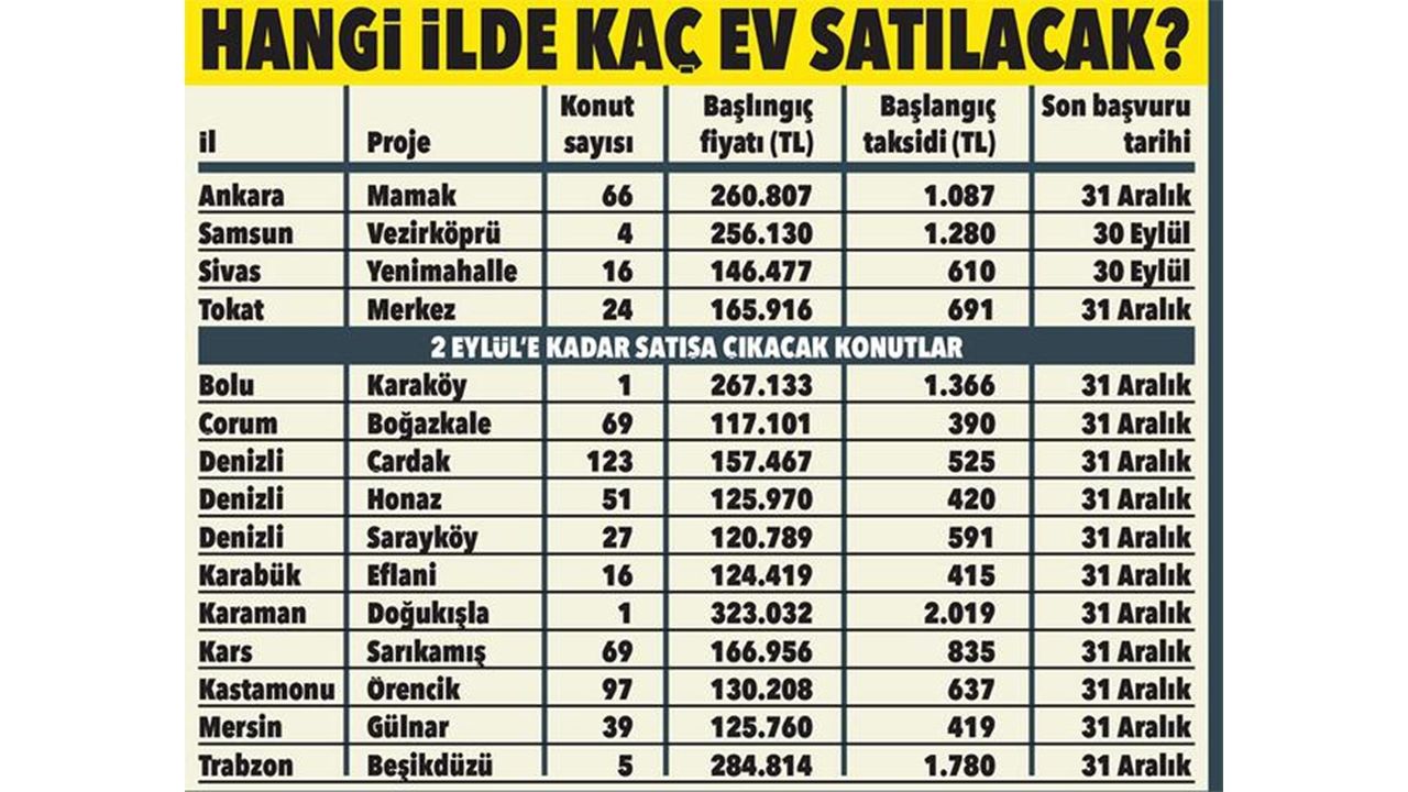 2 oda 1 salon ile 3 oda 1 salon seçenekli konutların başlangıç fiyatları 117 bin TL'den başlayıp 323 bin TL'ye kadar çıkıyor. Konutların en düşük taksit tutarı 390 TL olarak belirlendi. Alım koşulları illere ve projelere göre değişiyor. Buna göre, yüzde 10, 12, 15, 25 peşinat ve 96, 108, 120, 144, 180 ve 240 ay vade ile ev sahibi olunabilecek.