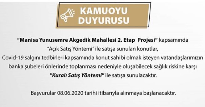 TOKİ'nin resmi internet sitesi üzerinden yayımlanan duyuruda Toplu Konut İdaresi Başkanlığı tarafından Manisa Yunusemre Akgedik Mahallesi 2. Etap 1. ve 2. Kısım Projeleri kapsamında satışa sunulacak olan konutlar için başvuru ücreti bin lira ve başvuru tarihi 8-12 Haziran olarak ilan edildi.