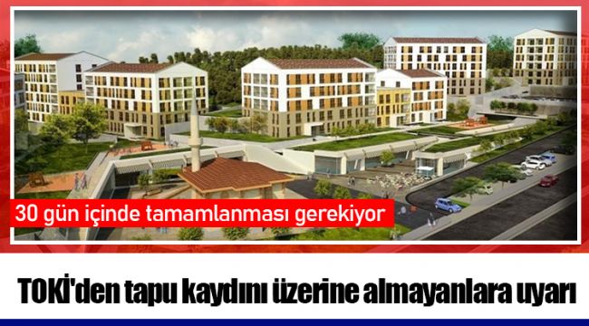 TOKİ'den yapılan yazılı açıklamada, ilgili bankalar aracılığıyla "Gayrimenkul Satış Sözleşmesi" karşılığı satın alınmış, borcunun bitmesine rağmen tapu kaydını üzerine almayan vatandaşların, tapu devir işlemlerini 30 gün içinde tamamlamaları gerektiği bildirildi.