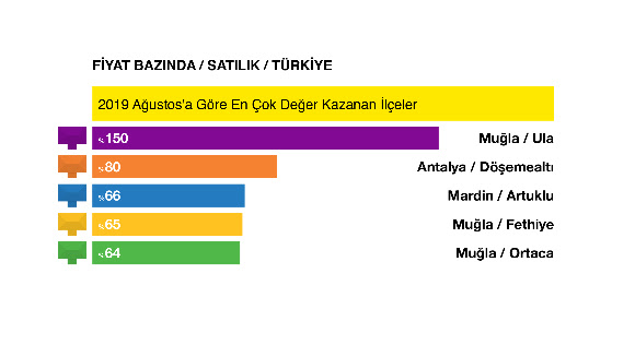 sahibinden.com’un Ağustos ayı emlak endeksi verilerine göre, Türkiye genelinde satılık konut fiyatları bazında en çok değer kazanan ilk 5 ilçe sırasıyla %150 artışla Muğla/Ula, %80 ile Antalya/Döşemealtı, %66 ile Mardin/Artuklu, %65 ile Muğla/Fethiye, %64 ile Muğla/Ortaca olarak kaydedildi.