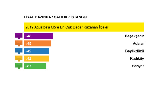 İstanbul’da Ağustos ayında ortalama satılık konut fiyatları bir önceki aya göre %3,3 oranında arttı. İstanbul’da satılık konutların ortalama satış süresi ise 37 gün olarak belirlendi. Ülke nüfusunun yaklaşık yüzde 20’sinin ikamet ettiği İstanbul’da; yıllık bazda%48 oranındaki artışla en çok değer kazanan Başakşehir’i, %45 ile Adalar, %42 ile Beylikdüzü ve Kadıköy, %37 ile Sarıyer ilçeleri izledi.
