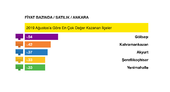 Başkent Ankara’da da satılık konut fiyatları Ağustos ayında bir önceki aya oranla %2,3 yükseldi. Satılık konutların ortalama satış süresi ise 35 gün seviyesinde gerçekleşti. Ankara’nın doğayla iç içe ilçelerinden Gölbaşı satılık konut fiyatlarında son 1 yılda %54’lük artışla en çok değer kazanan ilçe oldu. Ankara’nın ilçeleri arasında yer alan Kahramankazan %42, Akyurt %37, Şereflikoçhisar ve Yenimahalle de %33 oranında değer kazanan ilçeler olarak sıralandı.