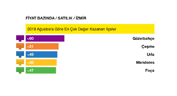 Türkiye’nin en büyük projelerinden İstanbul-İzmir otoyolunun tamamlanmasıyla birlikte, şehirlerarası ulaşımın daha da kolaylaştığı İzmir’de, Ağustos ayında satılık konut fiyatları Temmuz ayına göre %3,2 oranında arttı. Satılık konutların ortalama satış süresi ise 38 gün oldu. Geçtiğimiz ayın da en çok değer kazanan ilçesi Güzelbahçe, Ağustos’ta da satılık konut fiyatlarında geçen yıla göre %60’lık artışla listede yine en çok değer kazanan ilçe olarak yerini aldı. Güzelbahçe’yi takiben Çeşme %51, Urla %49, Menderes %48, Foça %47 oranında değer kazandı.