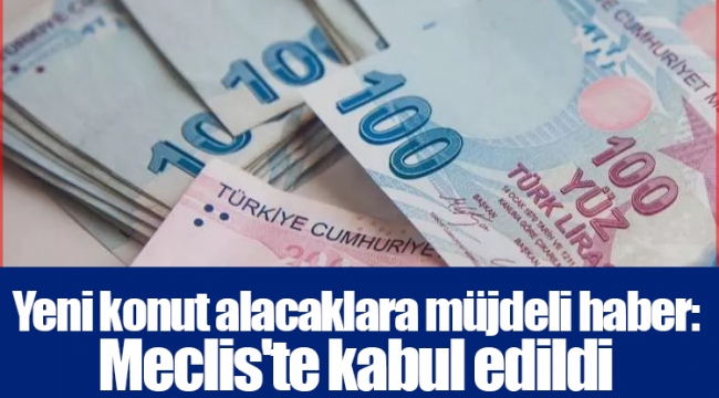 AK Parti milletvekillerinin imzasını taşıyan Yeni Konut Finansman Programı'na ilişkin Kamu Finansmanı ve Borç Yönetiminin Düzenlenmesi Hakkında Kanunda Değişiklik Yapılmasına İlişkin Kanun Teklifi, TBMM Genel Kurulu'nda kabul edilerek yasalaştı.